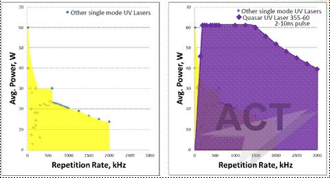 圖2:傳統(tǒng)DPSS調(diào)Q紫外激光器和Quasar可實現(xiàn)的參數(shù)范圍。