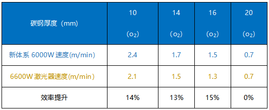 從表中可以看出,切割同樣厚度的不銹鋼,新體系6000W在4-10mm的切割效率提升了20%以上,尤其是5mm厚度的不銹鋼提升達到50%,切割速度提升尤為明顯。 2輔助氧氣切割碳鋼對比 滿功率情況下,新體系6000W激光器和6600W激光器輔助氧氣切割碳鋼進行工藝測試,數(shù)據(jù)對比表如下: