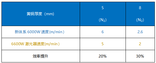 從表中可以看出,切割同樣厚度的鋁合金,新體系6000W的效率基本提升了近30%以上,中薄板鋁合金切割效率提升非常明顯。 4輔助氮氣切割黃銅對比 滿功率情況下,新體系6000W激光器和單模塊6600W激光器輔助氮氣切割黃銅進行工藝測試,數(shù)據(jù)對比表如下:
